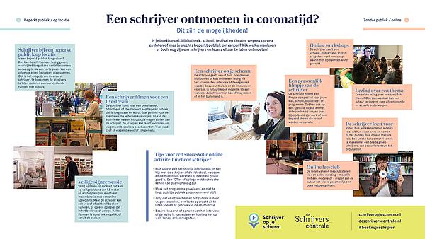 Is je boekhandel, bibliotheek, school, festival en theater wegens corona gesloten of mag je slechts beperkt publiek ontvangen? Kijk hier voor een handig overzicht van mogelijkheden waarop schrijvers en lezers elkaar coronaproof kunnen ontmoeten. Zonder of met (beperkt) publiek, online en op locatie!
